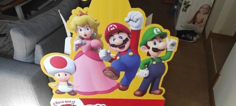 Vendo cartaz publicitário Nintendo Super Mario de cartão, parceria com a Vaca que Ri. Foi usado para divulgar o passatempo e expor os produtos da marca em alguns minimercados em Portugal durante a duração da campanha.